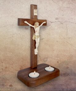 Ołtarzyk drewniany z krzyżem, który można wyjąć i powiesić na ścianie. Ołtarz wykonany z drewna egzotycznego o wyjątkowej fakturze. Mieni się w zależności od kąta patrzenia. Ołtarz jest olejowany. Olej doskonale uwypukla słoje drewna, nadaje matowego połysku i uwydatnia naturalny brąz drewna. Krzyż z tyłu posiada zawieszkę.